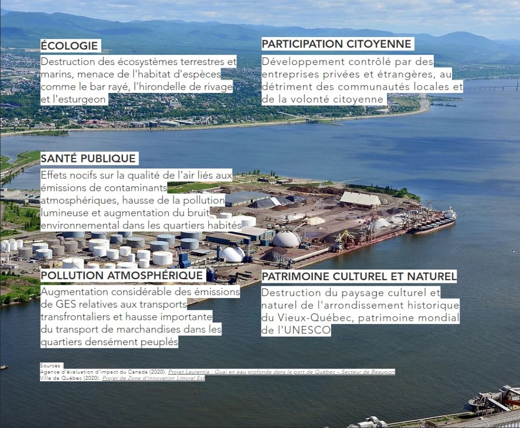 Une conclusion fondée sur les données de 2015-2017 acquises à la station de mesures Vieux-Limoilou située à environ 2 kilomètres au sud-ouest du projet qui révélait pour cette période «une concentration moyenne annuelle de PM2,5 de 9,3 μg / m3: soit une concentration supérieure à la norme (Normes canadiennes de la qualité de l’air ambiant2 (NCQAA)) du Conseil canadien des ministres de l’Environnement (CCME) pour 2020 qui est de 8,8 μg / m3 [36] ».