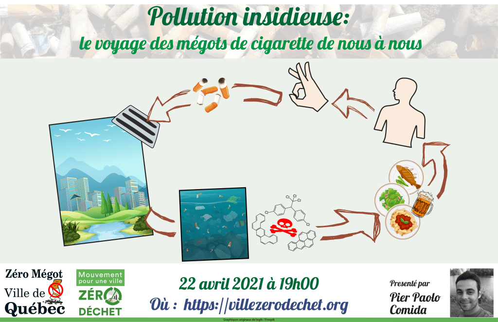 Pier Paolo Comida, membre du MVZD, fondateur de Zéro Mégot ville de Québec et doctorant en sciences de la Terre, dévoilera les conséquences insidieuses engendrées par le simple geste de jeter un mégot de cigarette au sol.