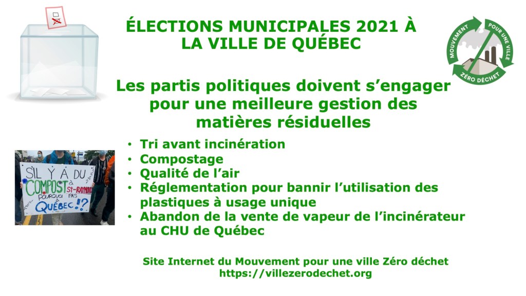 Pour en savoir plus, on peut lire notre document Élections municipales 2021 à la Ville de Québec Nos attentes pour une meilleure gestion des matières résiduelles.